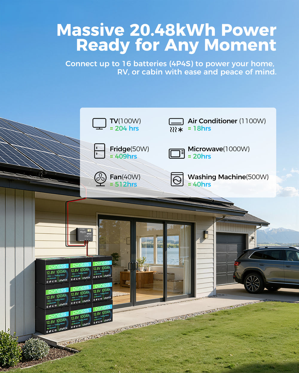 Note: This battery is not suitable for use as a starter battery, golf cart battery, or for high-power applications such as water pumps, electric jacks, lifts, vacuums, or 4WD lawn tractors. For more details, please contact Dyness at dynesssupport@dyness-tech.com