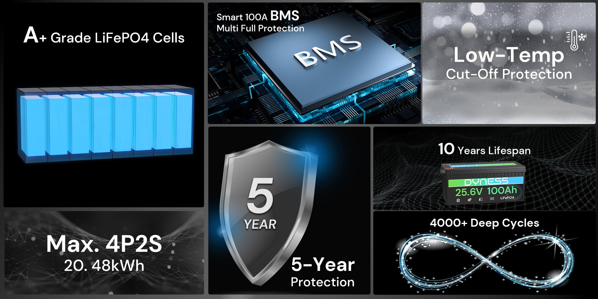 Dyness is committed to quality and safety. To provide users with safer, more environmentally friendly, and more efficient lithium batteries, we use A+ grade lithium iron phosphate (LiFePO4) cells. These top-quality cells can achieve over 4,000 deep cycles at 100% depth of discharge, resulting in a lifespan exceeding 10 years. Dyness lithium batteries are designed to last you longer.