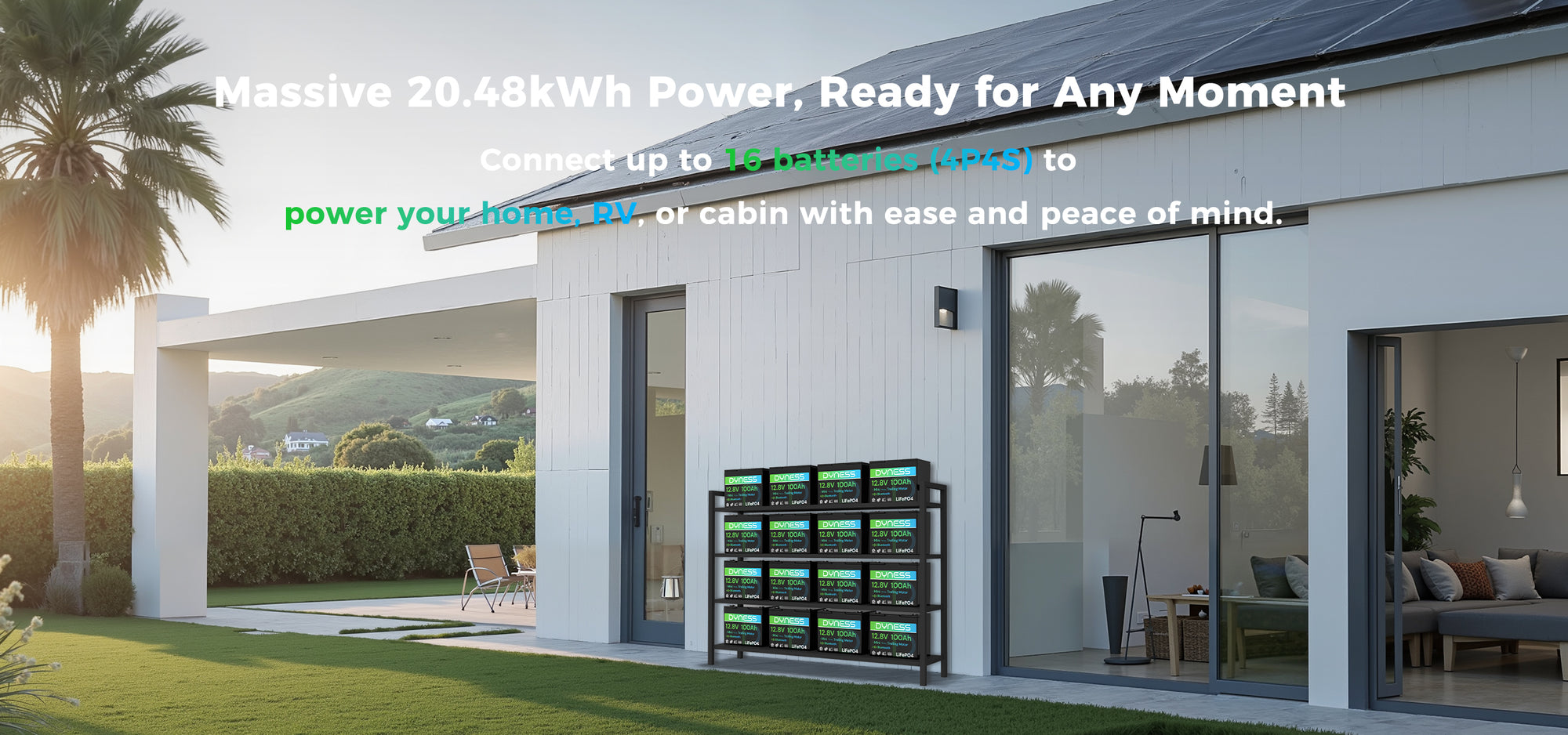 The Dyness 12V 100Ah LiFePO₄ battery supports 4P4S configurations to create a powerful 51.2V 400Ah system. Delivering up to 20.48kWh of energy, it provides ample power for both indoor needs and outdoor adventures. Customize your power solutions to fit your lifestyle — with ultra-reliable energy that takes the stress out of life and lets you journey with ease.