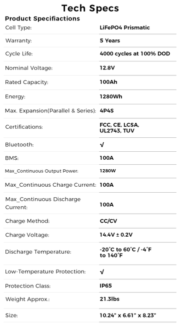 The Dyness 12V 100Ah Bluetooth LiFePO4 battery delivers up to 10 years of service life and comes with a 5-year warranty. It supports 4,000 cycles at 100% depth of discharge (DOD), 6,000+ cycles at 80% DOD, and over 15,000 cycles at 60% DOD. For optimal performance, charge at 14.6V with a 20A current—fully charging in about 5 hours.