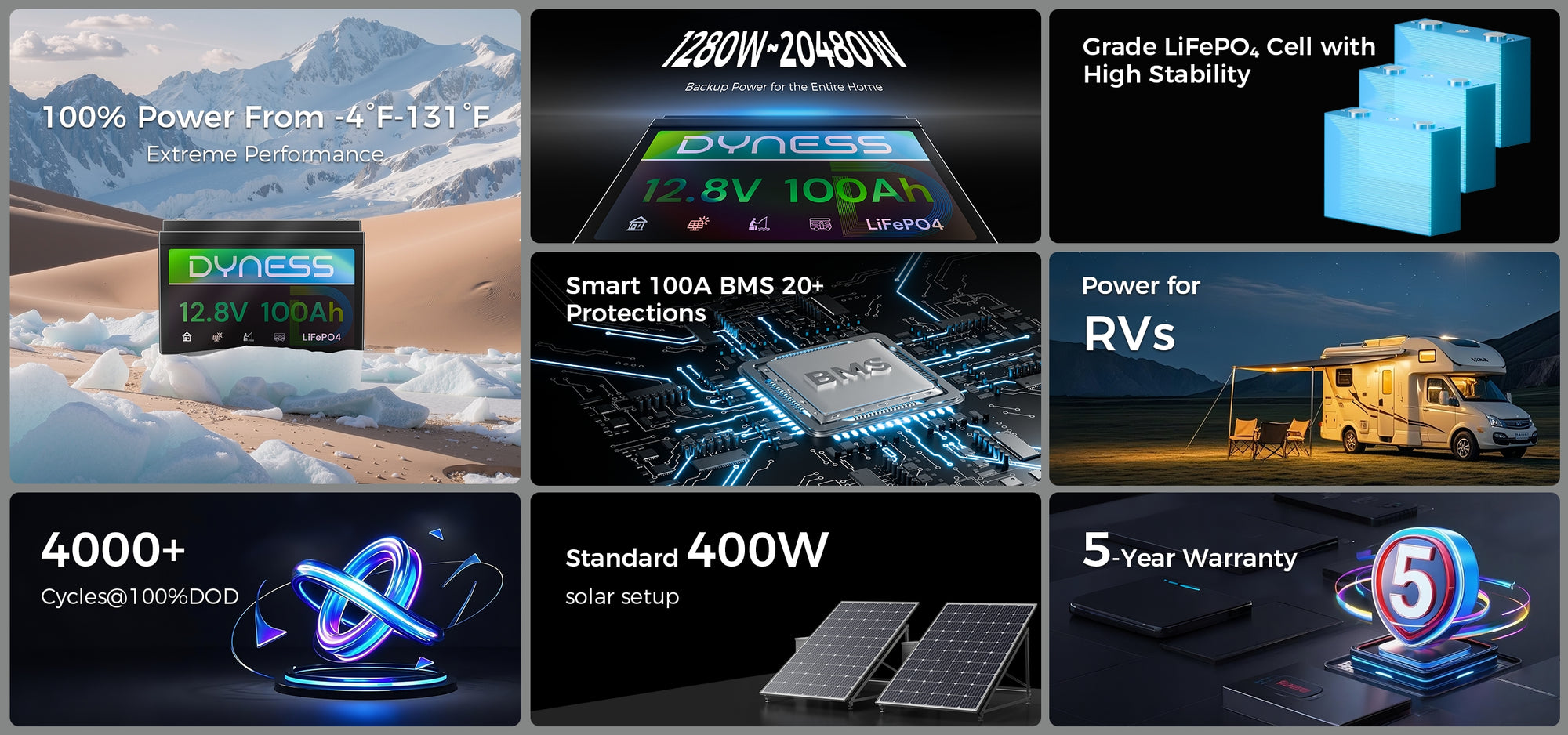 Dyness pushes the boundaries with its A-grade cells and powerful 100A battery management system (BMS). With a lifespan of 4,000-15,000 cycles and a 10-year lifespan, we're not just making batteries; we're redefining excellence in outdoor energy.