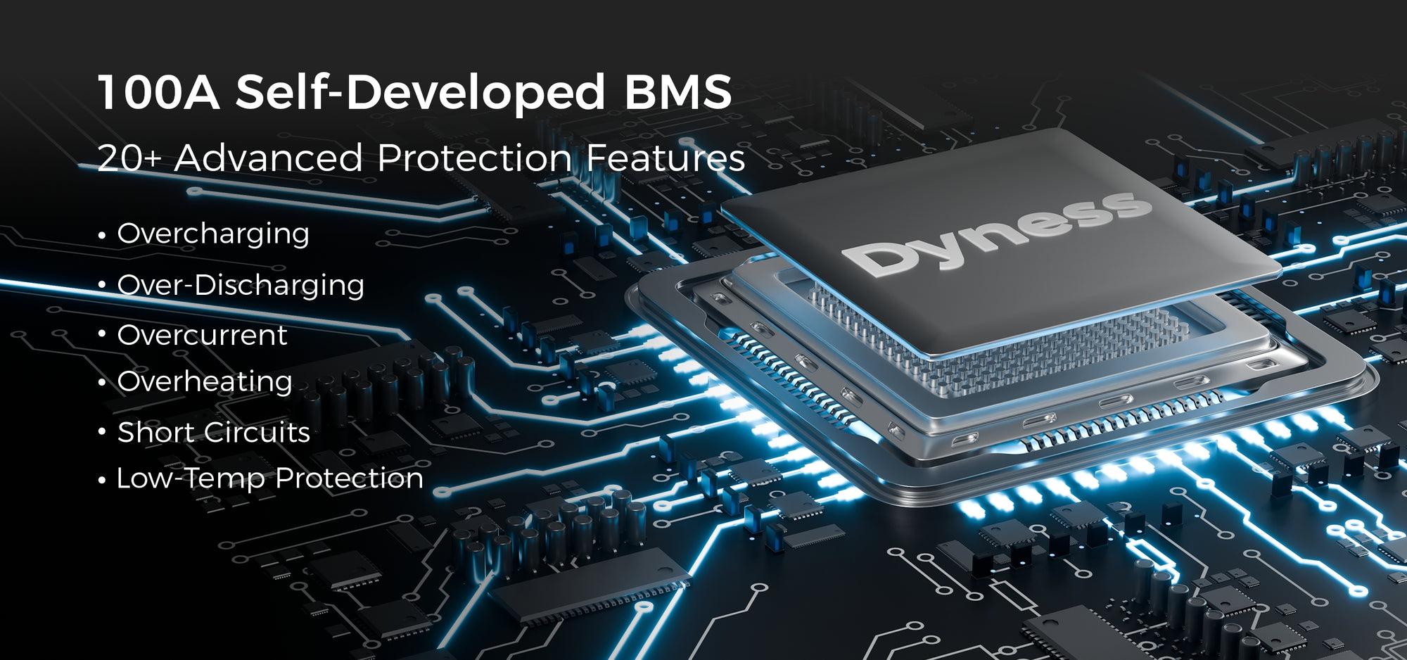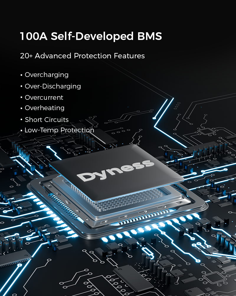 Dyness's proprietary BMS chip offers over 20 levels of protection, effectively preventing overcharging, overheating, short circuits, and extreme conditions. With a lifespan of 4,000 to 15,000 cycles, it is UL, CE, and UN certified. Built to last, it is designed to provide maximum protection.