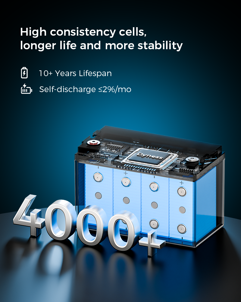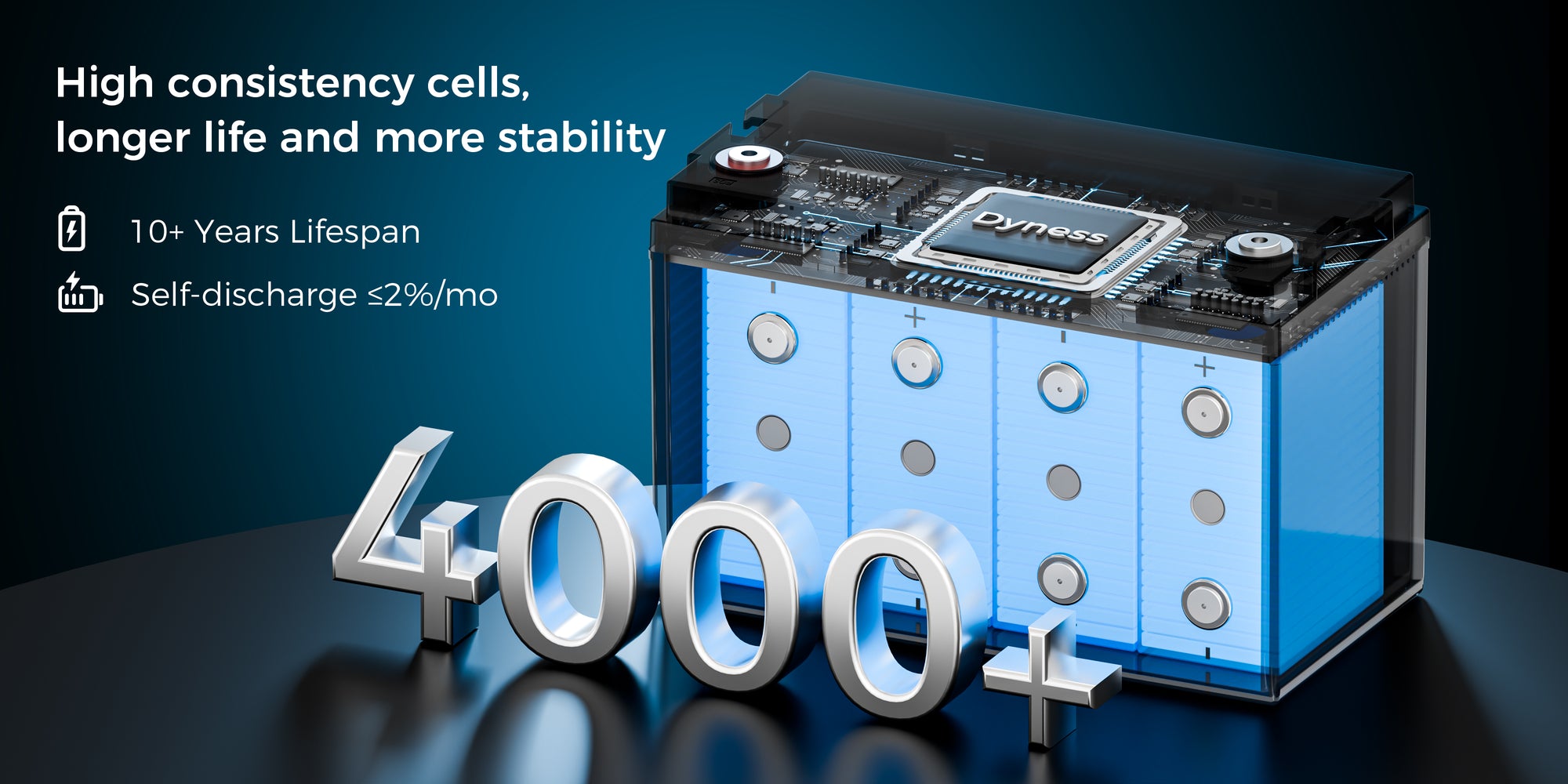 Dyness is committed to quality and safety. To provide users with safer, more environmentally friendly, and more efficient lithium-ion batteries, we use electric vehicle-grade lithium iron phosphate (LiFePO4) cells. These top-quality cells can achieve 4,000 deep cycles at 100% depth of discharge, with a service life exceeding 10 years. Dyness lithium-ion batteries are designed to last you longer.