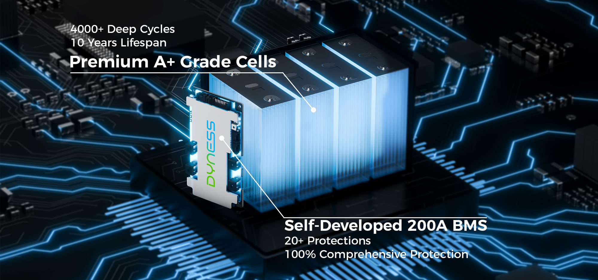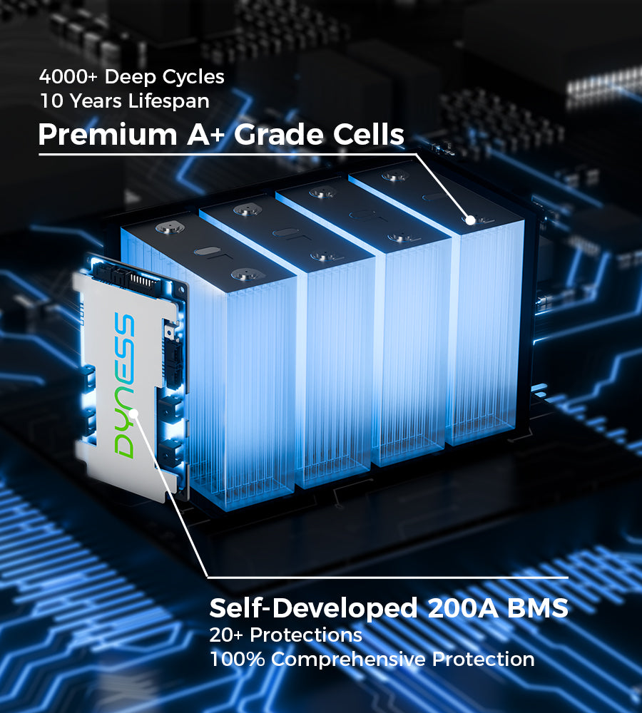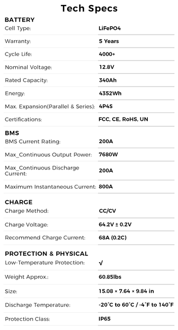 Proprietary 200A Battery Management System (BMS): Delivers 2560W of continuous power and supports up to 800A peak discharge for 1 second, ensuring stable, safe, and reliable performance even under heavy loads.