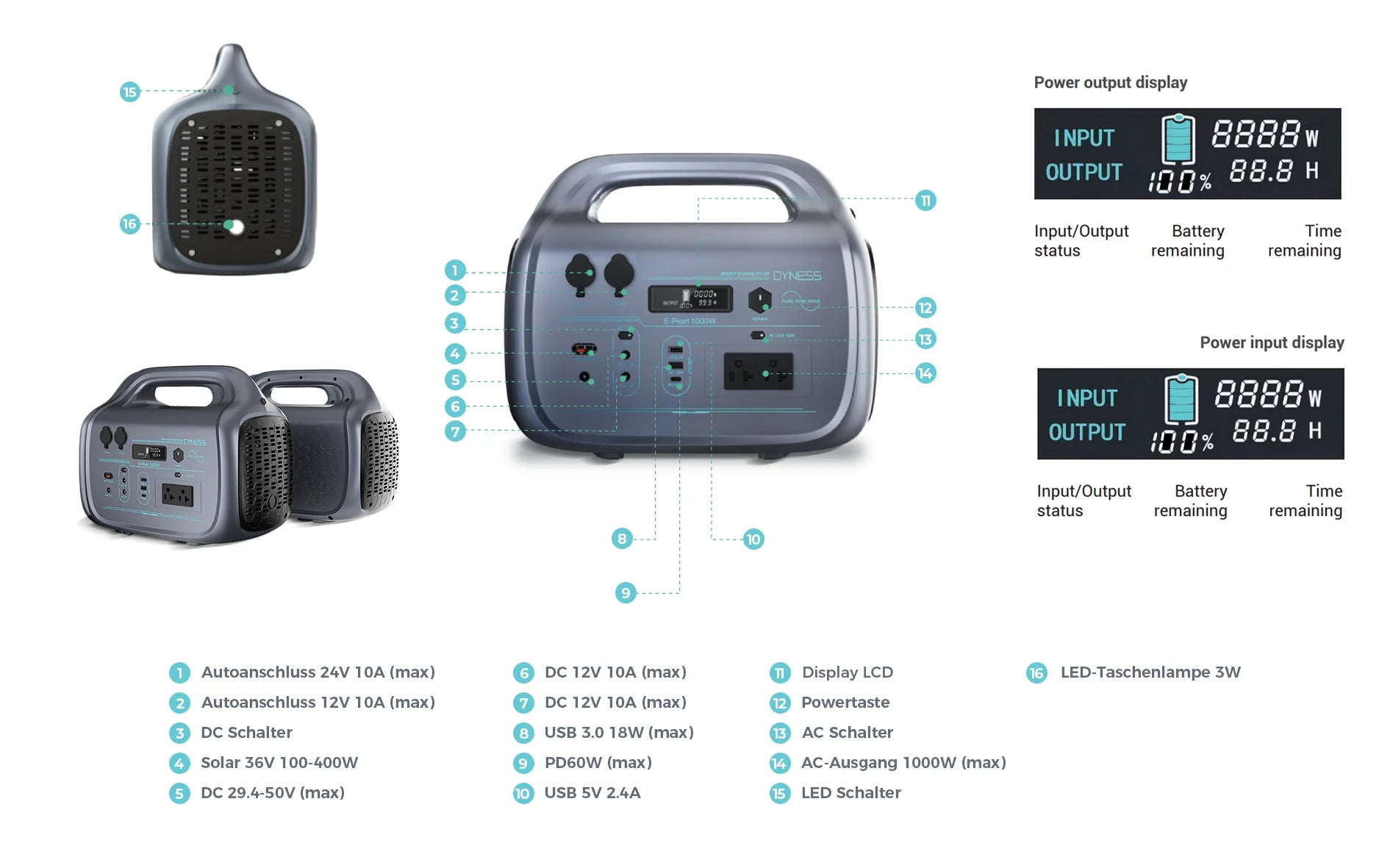 Multi-output interfaces: including 1000W pure sine wave AC output, USB-A, USB-C and other output interfaces, which the simultaneous charging of multiple electronic devices;