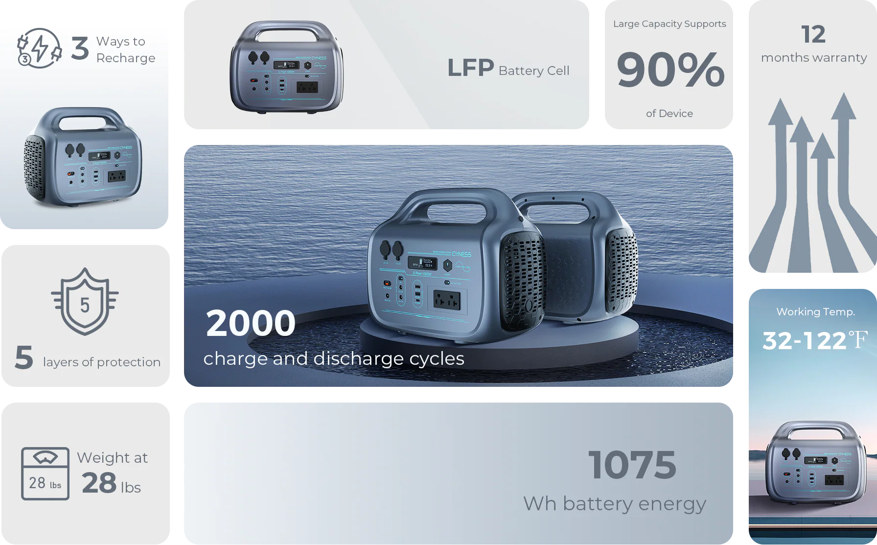 Large capacity: 1075Wh battery energy, which can provide long time continuous power support;